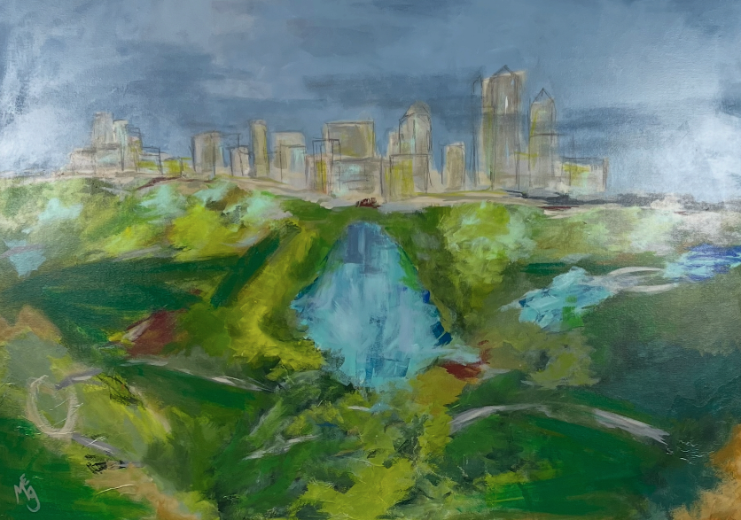 Hi, I’m Mary Emily Galysh — a mixed media artist drawn to texture, color, and Southern landscapes that feel both nostalgic and new. What began as a creative rehab after a hand injury has turned into a joyful and deeply personal art practice.